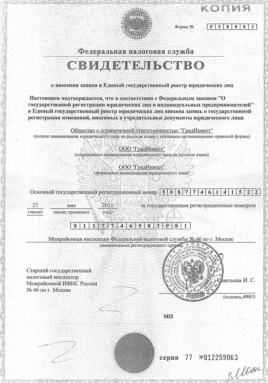 (Зарегистрировано и внесено в Единый государстевнный реестр юридических лиц Межрайонной инспекцией Федеральной налоговой службы №46 по г. Москве 20.07.2010.г., ГРН 9107747042493)